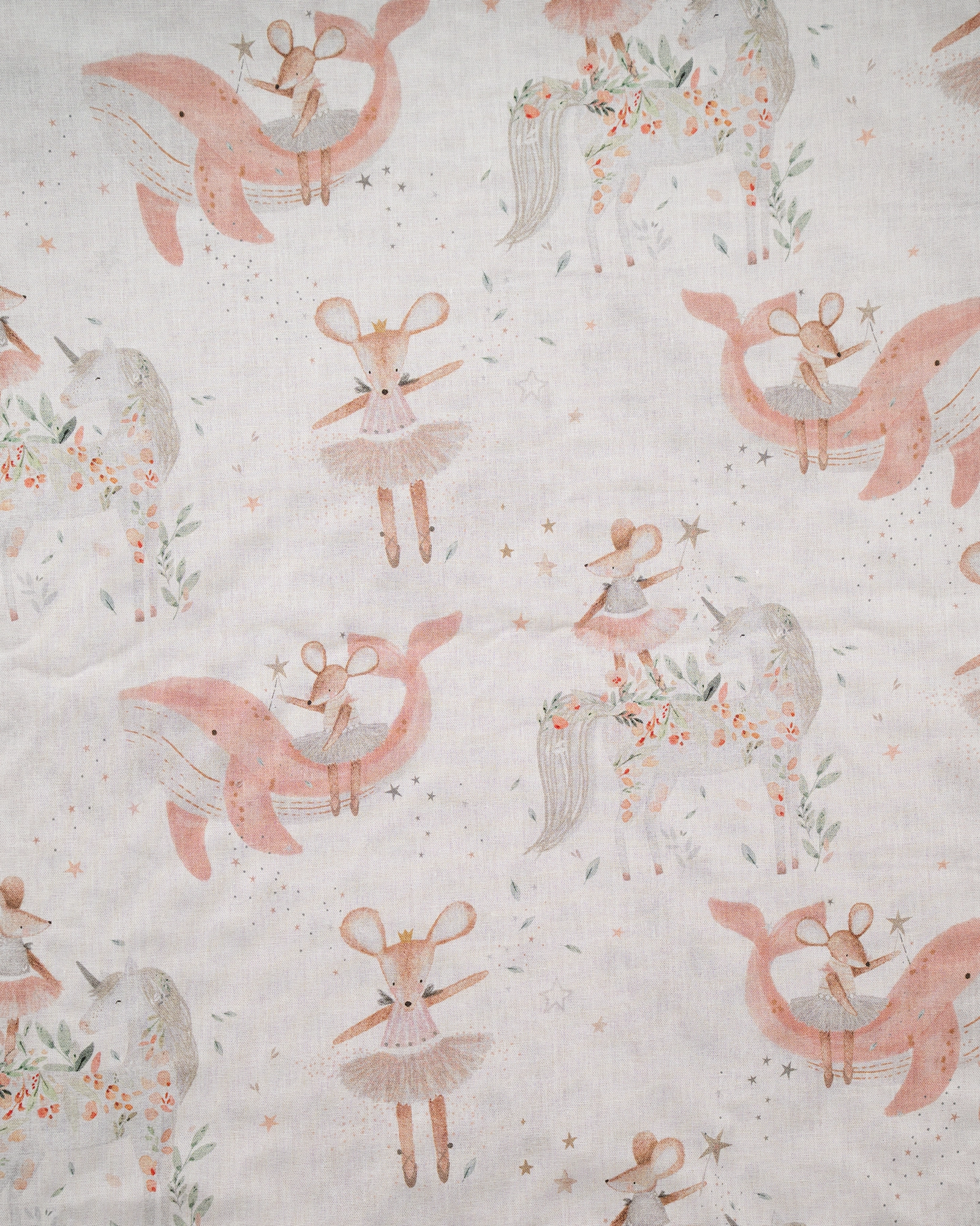 Cealaltă față este din bumbac poplin imprimat, cu model delicat în nuanțe pastel, cu motive de iepurași și balerine, un material cu aspect natural, respirabil și delicat cu pielea.