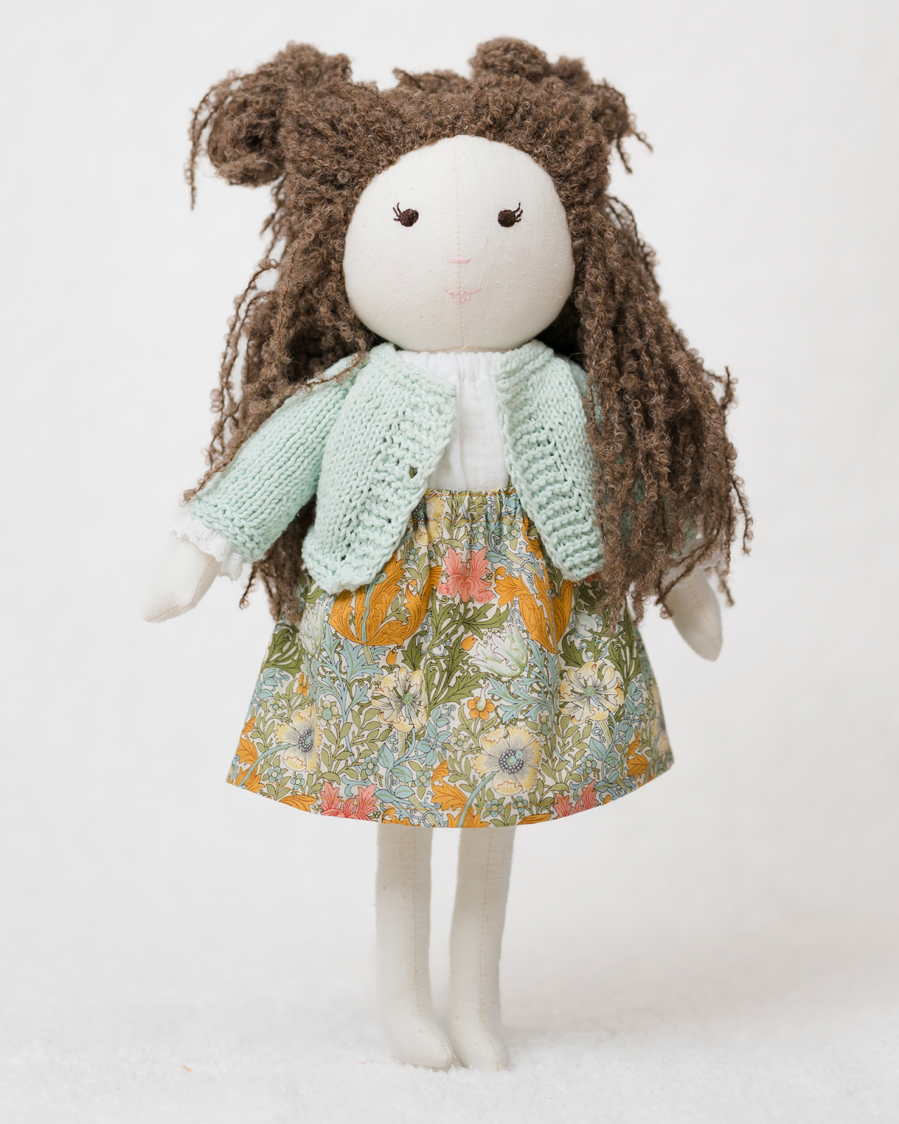 Această păpușă handmade de 45 cm poartă o bluză fină din bumbac, o fustiță florală și un cardigan tricotat manual, într-o combinație elegantă și armonioasă.