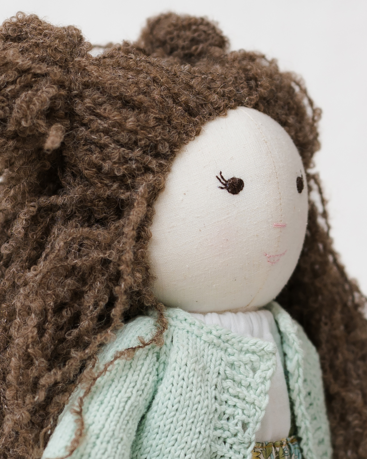 Designul delicat și materialele naturale transformă această păpușă într-un companion ideal pentru joacă sau decor.