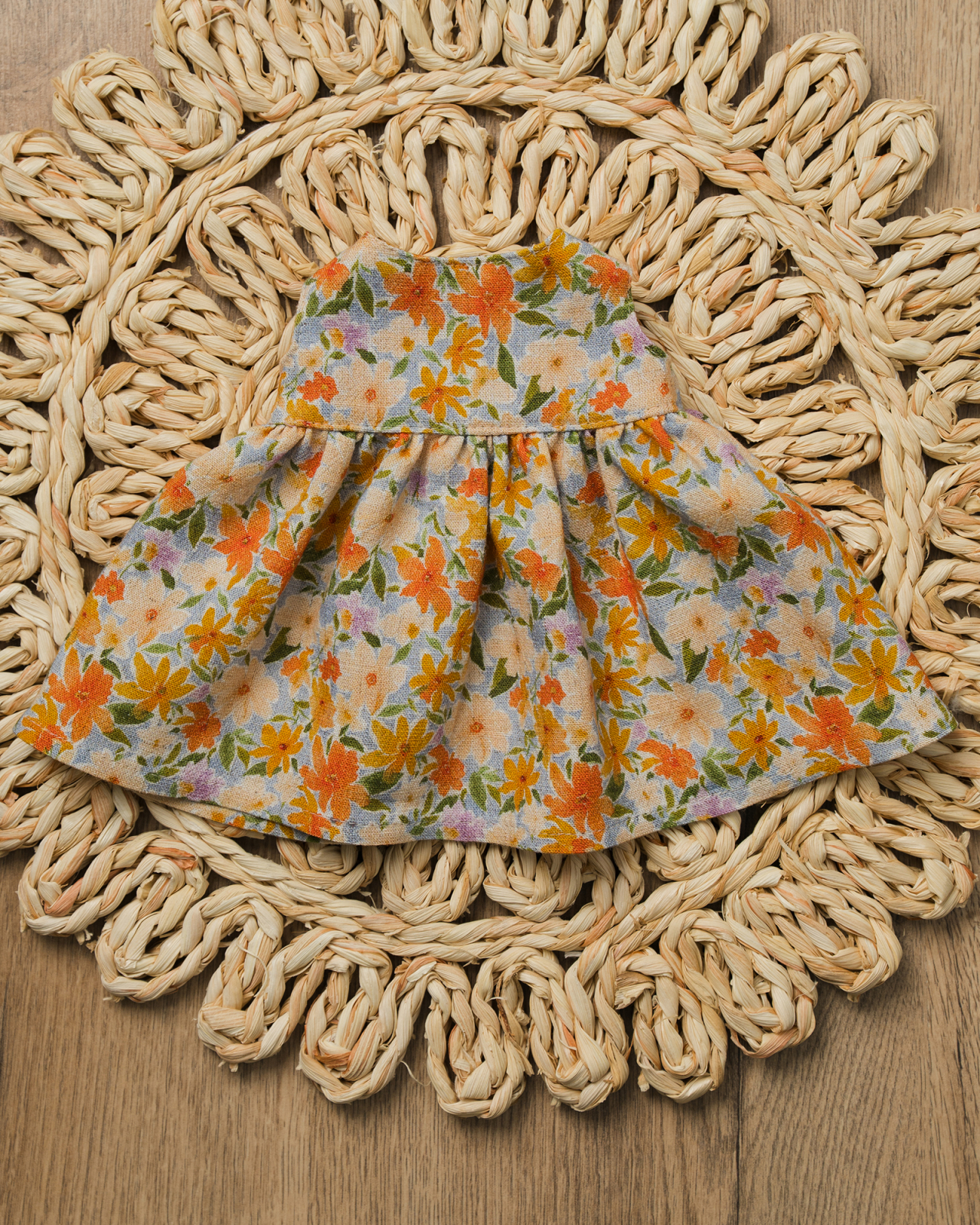Această rochiță pentru păpuși de 45 cm este realizată din in cu imprimeu floral în nuanțe calde (galben-portocaliu, cu accente verzi), oferind un aspect delicat și vesel. Croiul fără mâneci este comod și potrivit pentru joaca de zi cu zi, iar închiderea la spate cu 2 capse ajută la îmbrăcarea rapidă a păpușii, chiar și de către copii.