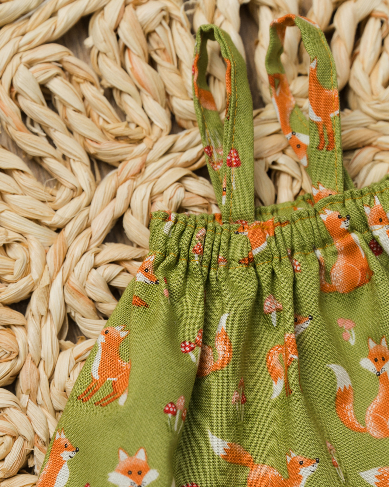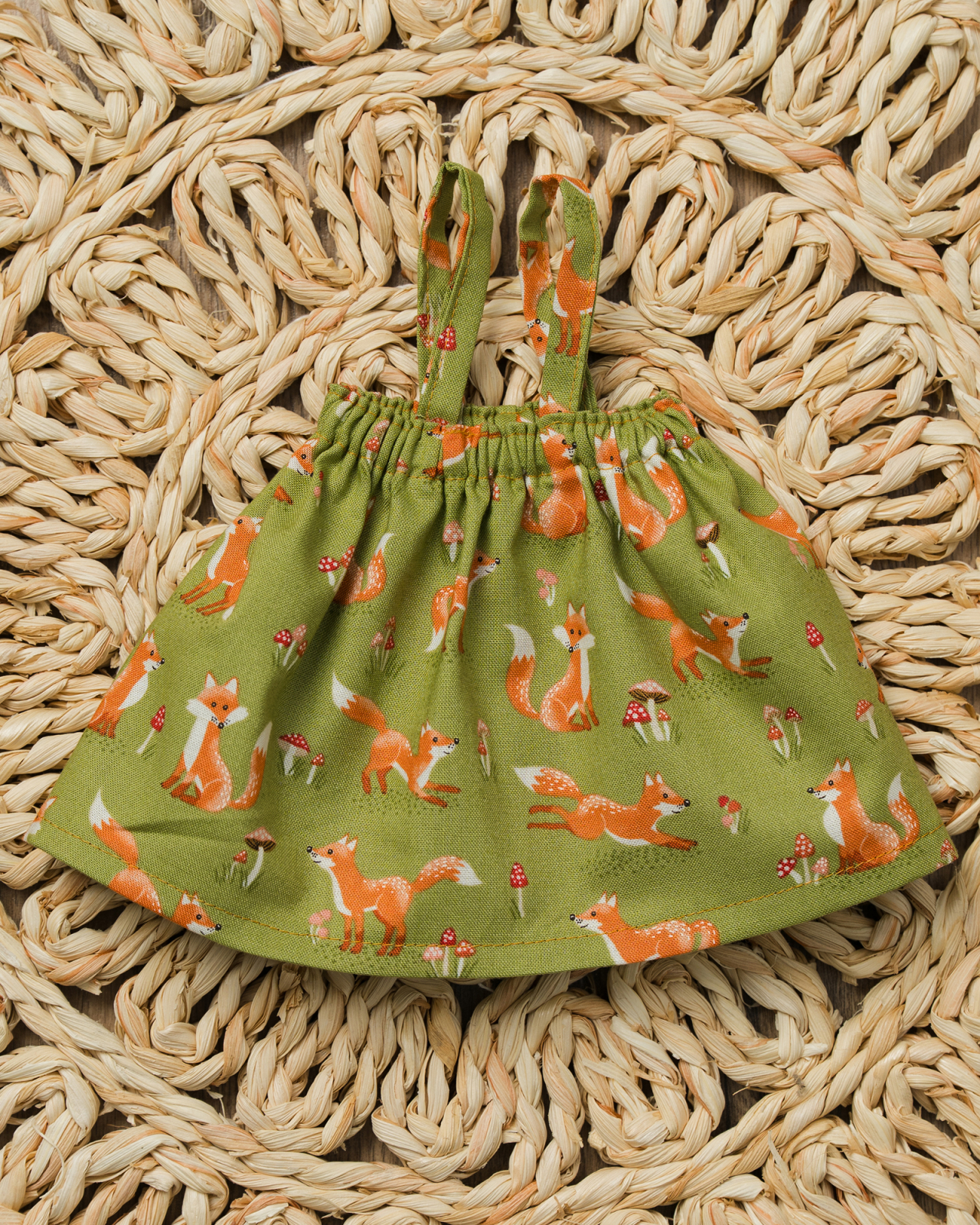 Această rochiță tip sarafan din bumbac pentru păpuși aduce un plus de culoare și farmec garderobei de păpuși. Materialul din bumbac este plăcut la atingere și potrivit pentru utilizare repetată, iar imprimeul cu vulpi jucăușe și ciupercuțe, pe fundal verde, transformă piesa într-o alegere adorabilă pentru joacă.