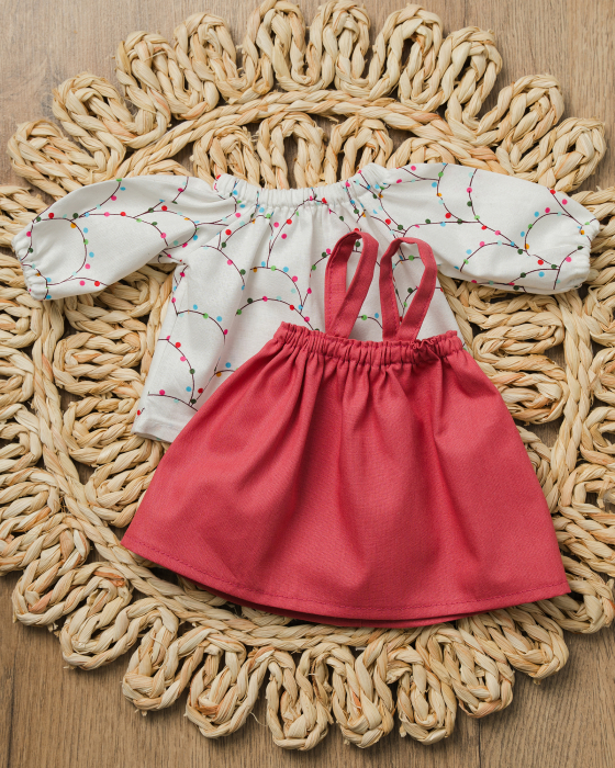 Acest set pentru păpuși este format din două piese ușor de combinat: o bluză cu imprimeu tip ghirlande de luminițe (pe fundal deschis) și o fustiță roz cu bretele, cu croi lejer. Împreună, creează o ținută veselă și practică, potrivită pentru joaca de rol și schimbarea rapidă a hainelor păpușii.