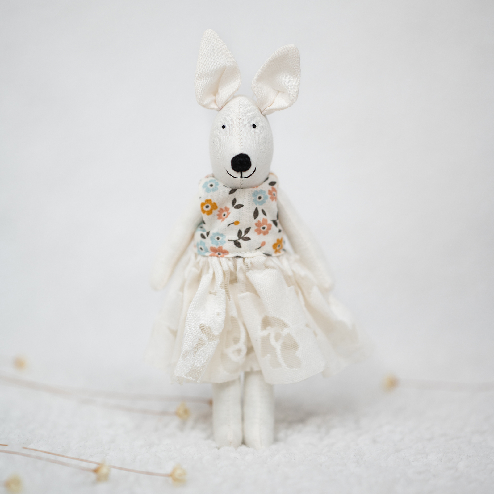 ÎMBRĂCĂMINTE: Iepurașul poartă o rochiță în stil romantic, cu imprimeu floral delicat, completată de o fustă din dantelă fină. Hainele fac parte din figurină, păstrându-și eleganța chiar și în timpul celor mai vesele aventuri.