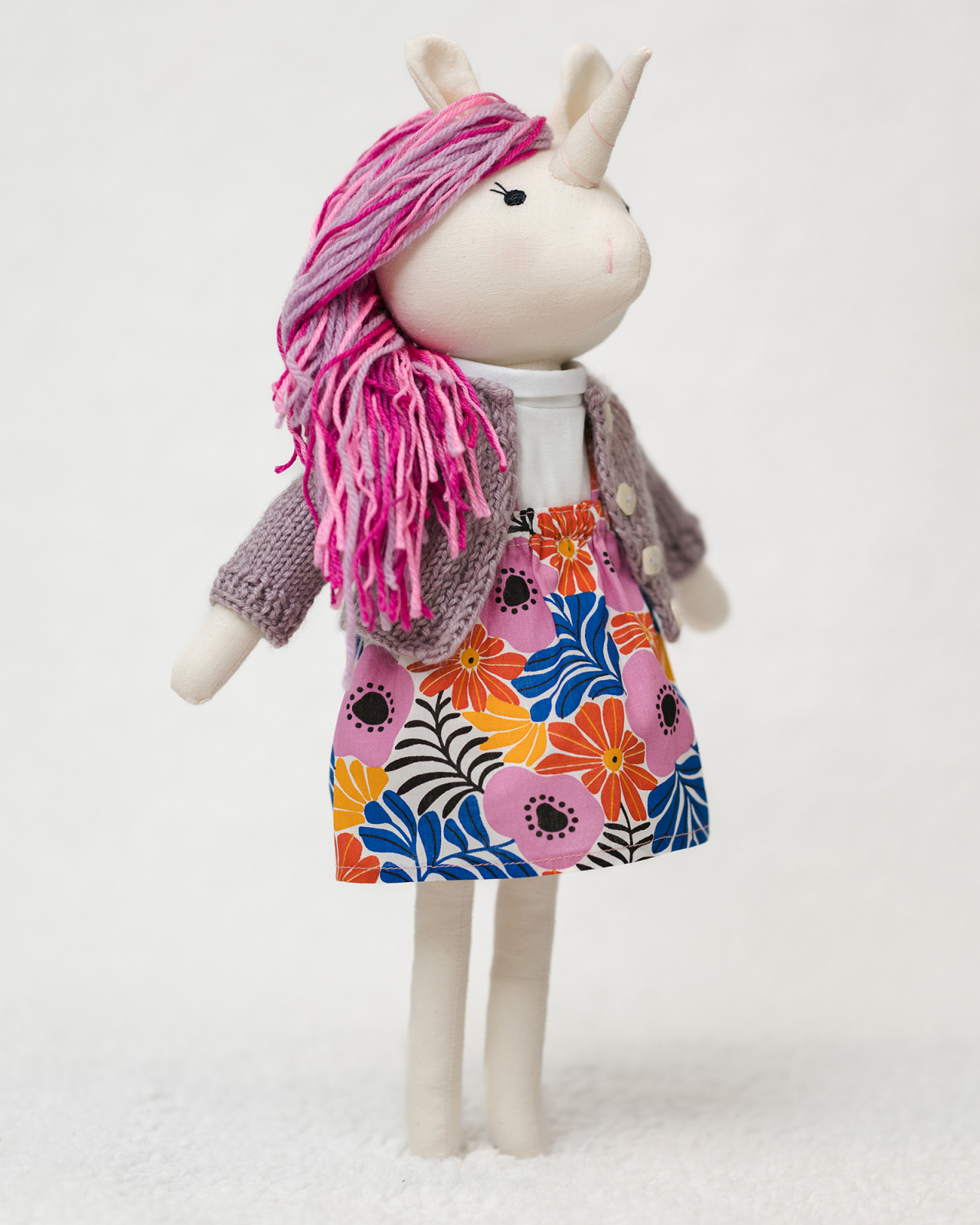 Unicorn în cardigan tricotat și fustiță florală