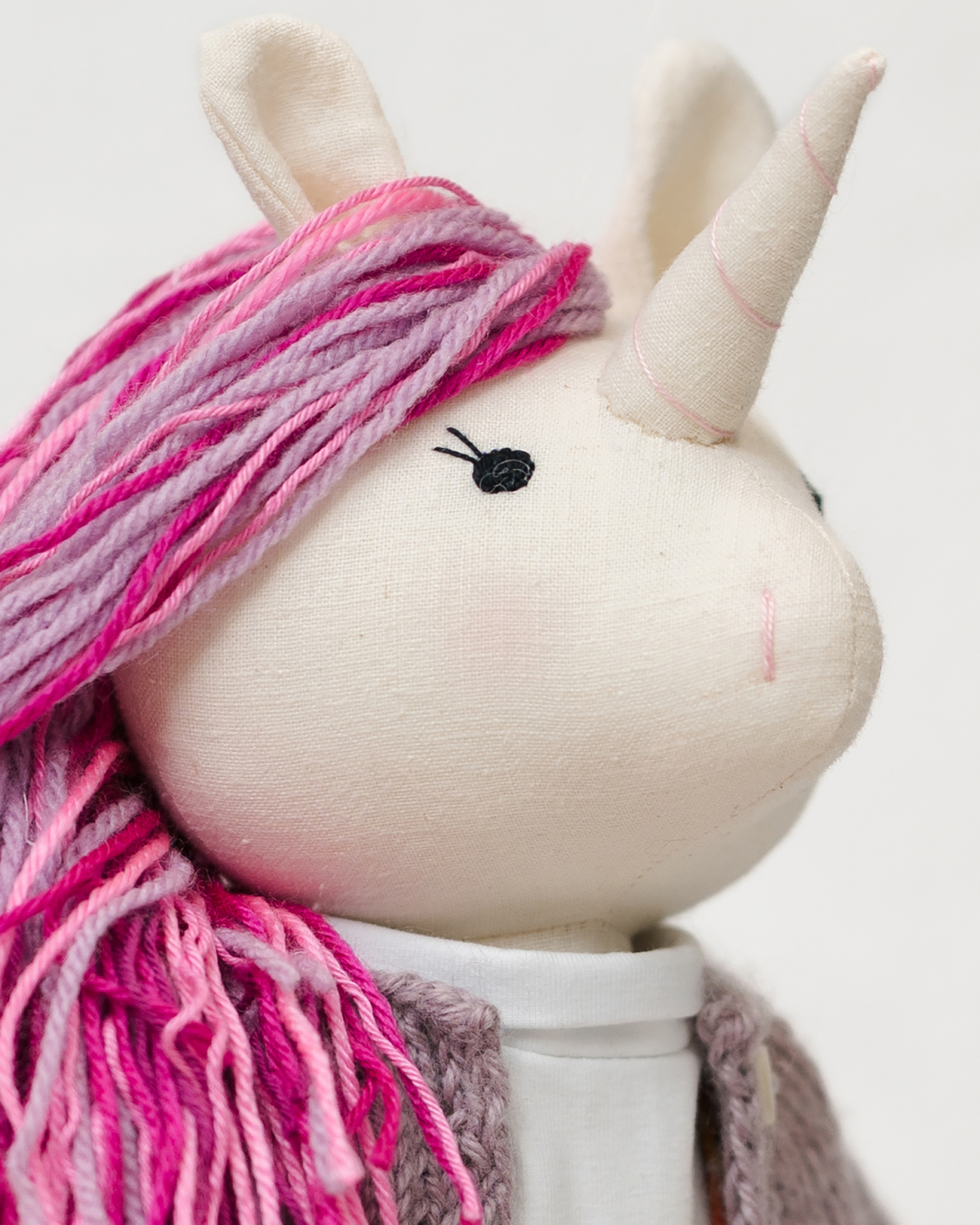 COMPOZIȚIE: Unicornul are o înălțime de aproximativ 45 cm. Corpul este realizat integral din in 100% de calitate superioară, material certificat OEKO-TEX Standard 100 Class I, fiind complet sigur și non-toxic. Este umplut ferm cu fibră hipoalergenică. Detaliul central este coama realizată din fire de lână în nuanțe de roz și lila, completată de trăsături brodate manual.