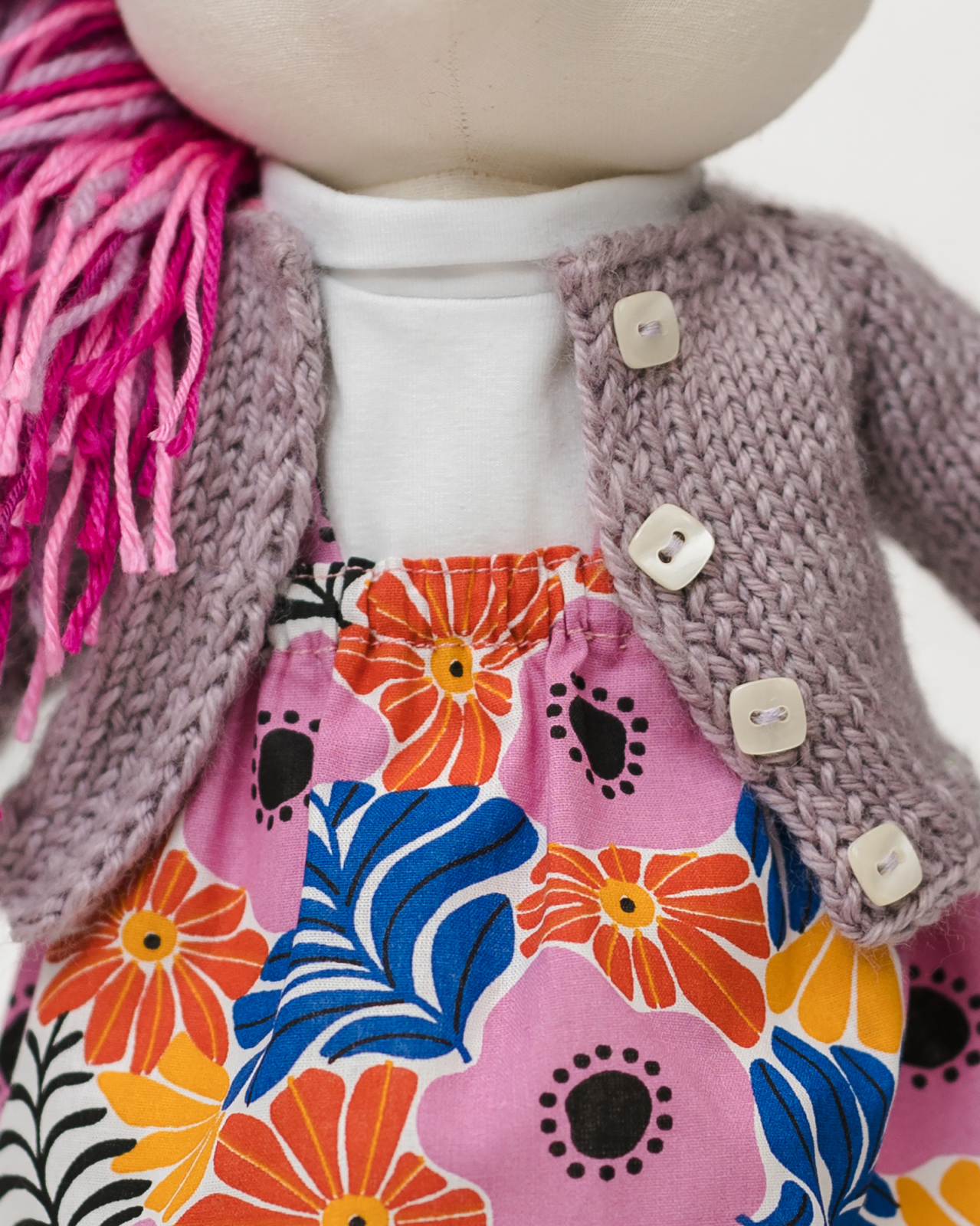 ÎMBRĂCĂMINTE: Poartă un outfit complet format din: bluziță din bumbac jersey moale (95% bumbac, 5% elastan), fustiță detașabilă din bumbac cu imprimeu floral vibrant și un cardigan tricotat în nuanța lavandei, prevăzut cu nasturi. Hăinuțele sunt detașabile, încurajând jocul interactiv.