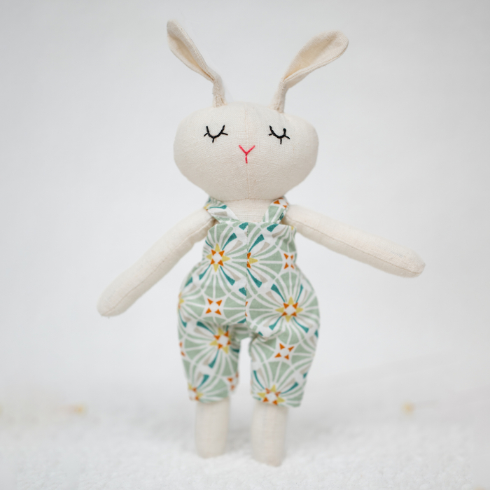 COMPOZIȚIE: Acest iepuraș drăguț măsoară aproximativ 22 cm. Corpul său este realizat din in natural de înaltă calitate și este umplut ferm cu fibră hipoalergenică. Trăsăturile delicate ale feței și ochii închiși sunt brodate manual, oferind fiecărei piese un caracter unic și irepetabil.